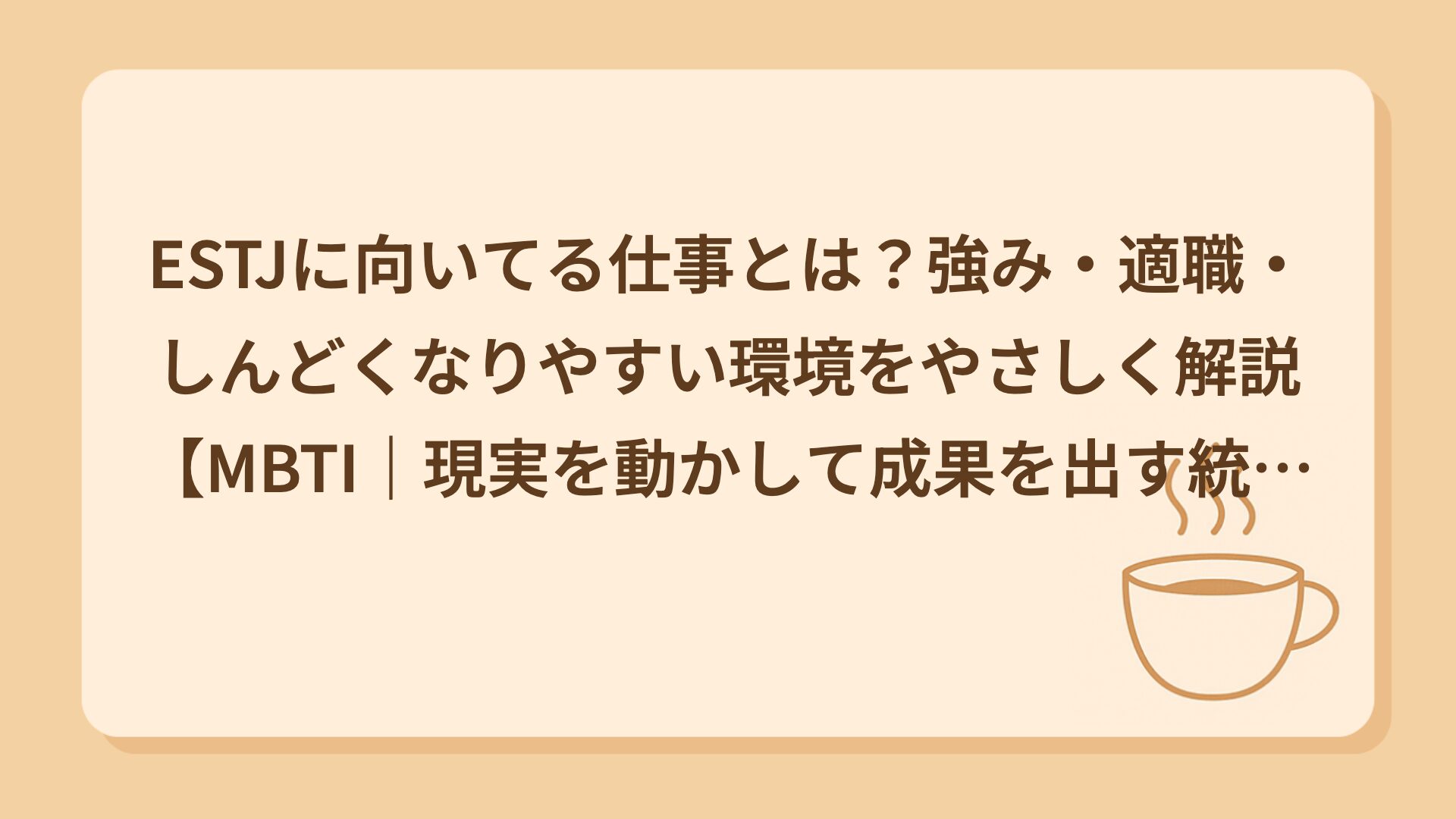 CATEGORY MBTIとは ISTPに向いてる仕事とは?強み・適職・しんどくなりやすい環境をやさしく解説【MBTI|冷静な実践力で問題を解決する職人タイプ】 2026.01.03 仕事 tmk03 ゆるっと性格カフェ ESFPに向いてる仕事とは?強み・適職・しんどくなりやすい環境をやさしく解説【MBTI|今この瞬間を楽しませるエンターテイナータイプ】 2026.01.03 仕事 tmk03 ゆるっと性格カフェ ESTPに向いてる仕事とは?強み・適職・しんどくなりやすい環境をやさしく解説【MBTI|行動力で現場を切り拓く起業家タイプ】 2026.01.03 仕事 tmk03 ゆるっと性格カフェ ESFJに向いてる仕事とは?強み・適職・しんどくなりやすい環境をやさしく解説【MBTI|人を支え、場を整える世話役タイプ】 2026.01.03 仕事 tmk03 ゆるっと性格カフェ ESTJに向いてる仕事とは?強み・適職・しんどくなりやすい環境をやさしく解説【MBTI|現実を動かして成果を出す統率者タイプ】 2025.12.23 仕事 tmk03 ゆるっと性格カフェ ENTPに向いてる仕事とは?強み・適職・しんどくなりやすい環境をやさしく解説【MBTI|アイデアで世界を動かす討論者タイプ】 2025.12.23 仕事 tmk03 ゆるっと性格カフェ ISTJに向いてる仕事とは?強み・適職・しんどくなりやすい環境をやさしく解説【MBTI|責任感で物事を支える管理者タイプ】 2025.12.22 仕事 tmk03 ゆるっと性格カフェ INTPに向いてる仕事とは?強み・適職・しんどくなりやすい環境をやさしく解説【MBTI|探究心で世界を理解し続ける論理学者タイプ】 2025.12.22 仕事 tmk03 ゆるっと性格カフェ INTJに向いてる仕事とは?強み・適職・しんどくなりやすい環境をやさしく解説【MBTI|戦略で未来を組み立てる建築家タイプ】 2025.12.22 仕事 tmk03 ゆるっと性格カフェ ISFPに向いてる仕事とは?強み・適職・しんどくなりやすい環境をやさしく解説【MBTI|感性で世界と向き合う冒険家タイプ】 2025.12.22 仕事 tmk03 ゆるっと性格カフェ もっと見る